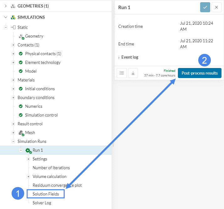 Once the simulation run is finished, you can post-process the pipe bending analysis results. To access the online post-processor you can use one of two methods: