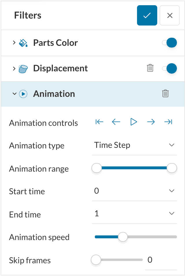 The animation of bending process can also be visualized. To create the animation, add an Animation filter, the same way the Displacement filter was created: