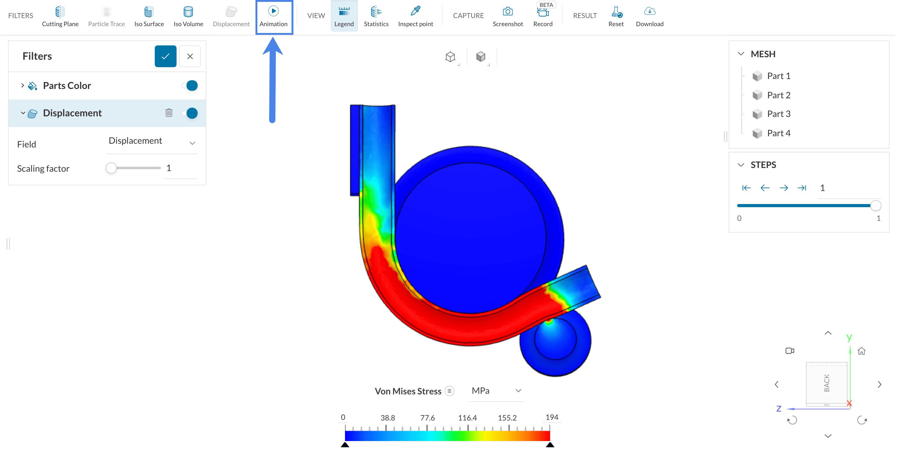 To visualize the deformation of the pipe and the movement of the parts, add a ‘Displacement‘ filter: