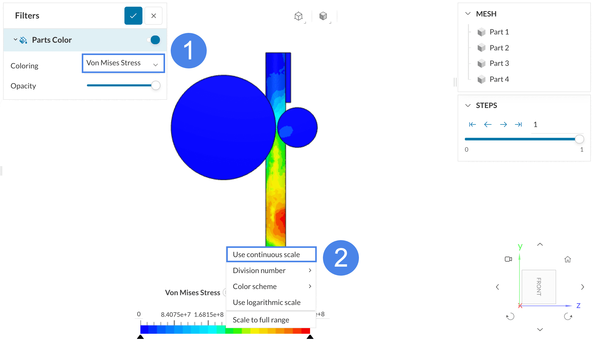 Initially select the ‘Von Mises Stress’ as Coloring, and right-click on the colour bar to pick the ‘Use Continuous Scale‘ option. This will provide a smoother visualization of the results.