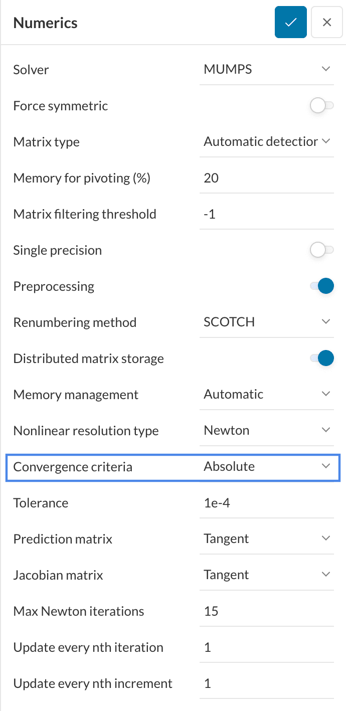 The Numerics parameters control the solver behavior and precision. In this case, we will only change one parameter: Convergence criteria. The default Relative criteria make use of the applied load magnitude to check the convergence of the computation. That is not possible in this simulation, because the model is driven by an imposed displacement so there are no loads. Accordingly, we need to change the criteria to Absolute, as shown in the picture: