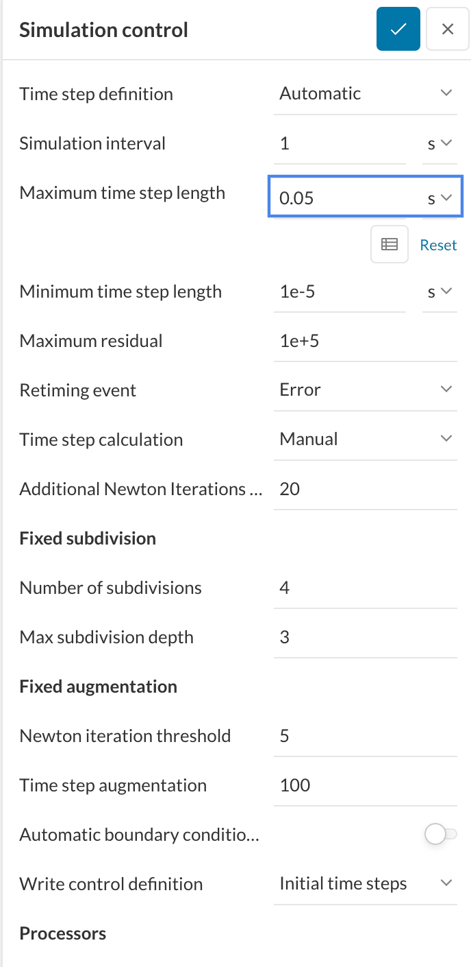 The Simulation control parameters, on the other hand, specify the simulation time, time step, time adaptation and output write interval. Fill in the simulation control settings as below: