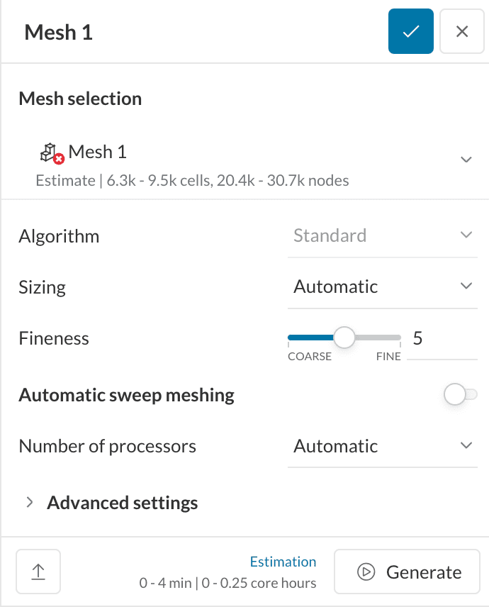 There is no need to generate the mesh at this point, because it will be computed as part of the simulation run. When the mesh computation is done, it will be marked with a green check-mark icon next to it. You can come back to it and view the resulting mesh: