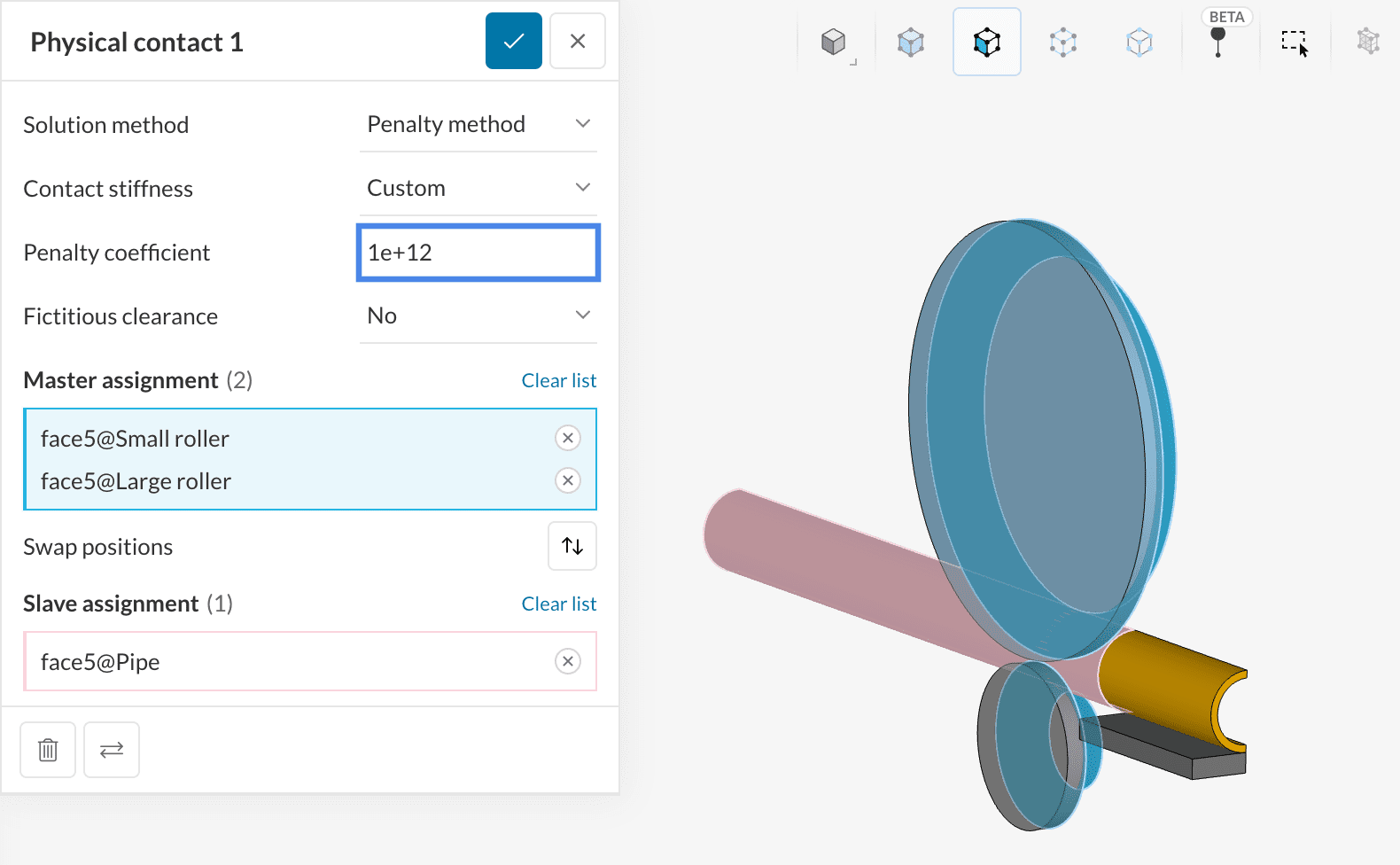 We now proceed to the Physical Contacts assignment. Physical contacts are used in touching surfaces that can slip, come into touch, separate, and transfer forces during the simulated process, such as the pipe and the rollers in our model. Friction effects can also be included, but they won’t be needed in this case. Follow the instructions below to create the physical contact model: