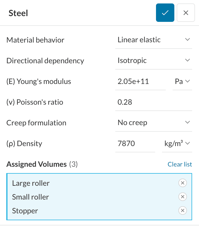 First create a Steel material item, which will be assigned to the Stopper, the Small roller, and the Large roller bodies. All other parameters can be left as default: