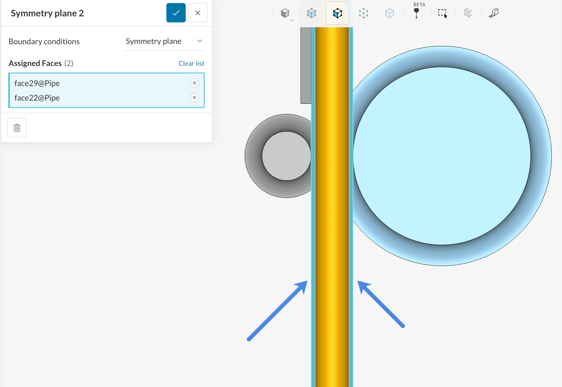 As you might have noticed, the geometry model includes only one-half of the pipe and the other bodies. This allows us to save on the mesh size and computation cost. A Symmetry plane boundary condition will be applied to the flat faces of the pipe (the other bodies have their degrees of freedom specified in the other boundary conditions, so no need to include them here). Create the boundary condition as explained above and assign the pipe symmetry faces as shown in the picture: