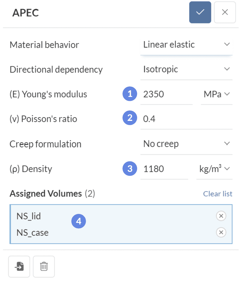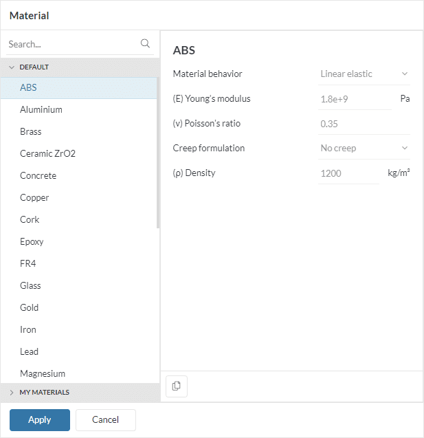 To create a new material definition, click the ‘+’ icon next to Materials in the simulation tree. The materials library window is displayed, where you can select a material model from the default library, or from your custom materials library.