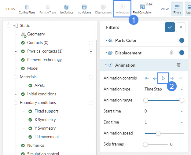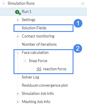 To visualize the results of the simulation you can use the online postprocessor. You can access it by selecting the ‘Solution Fields’ item under the successful simulation run (marked 1 in the figure):