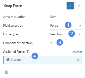 Measuring the force curve for the snap-fit process is one of the target results for our simulation. To obtain such a curve, one can use a Result control item. More specifically, an Area calculation over the same face with imposed displacement is able to retrieve the Sum of the Reaction Force.