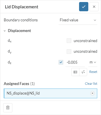 For the lid closing movement, we will use a Fixed value boundary condition. Set the \(d_x\) and \(d_y\) displacements as unconstrained, while the \(d_z\) displacement is set to -0.005 \(m\). Finally, assign the set named ‘NS_displace’.