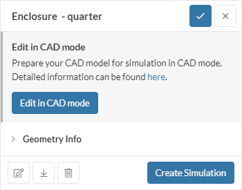 To create a new simulation using the enclosure geometry, first, make sure that the “Enclosure – quarter” geometry is selected (the geometry details window is shown as seen in Figure 2). Click on the ‘Create Simulation’ button.