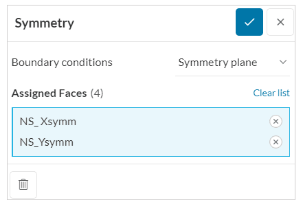 To specify the symmetry condition on the two symmetry planes in the model we will use a Symmetry plane boundary condition. Create the condition and assign the ‘NS_Xsymm’ and ‘NS_Ysymm’ sets to it: