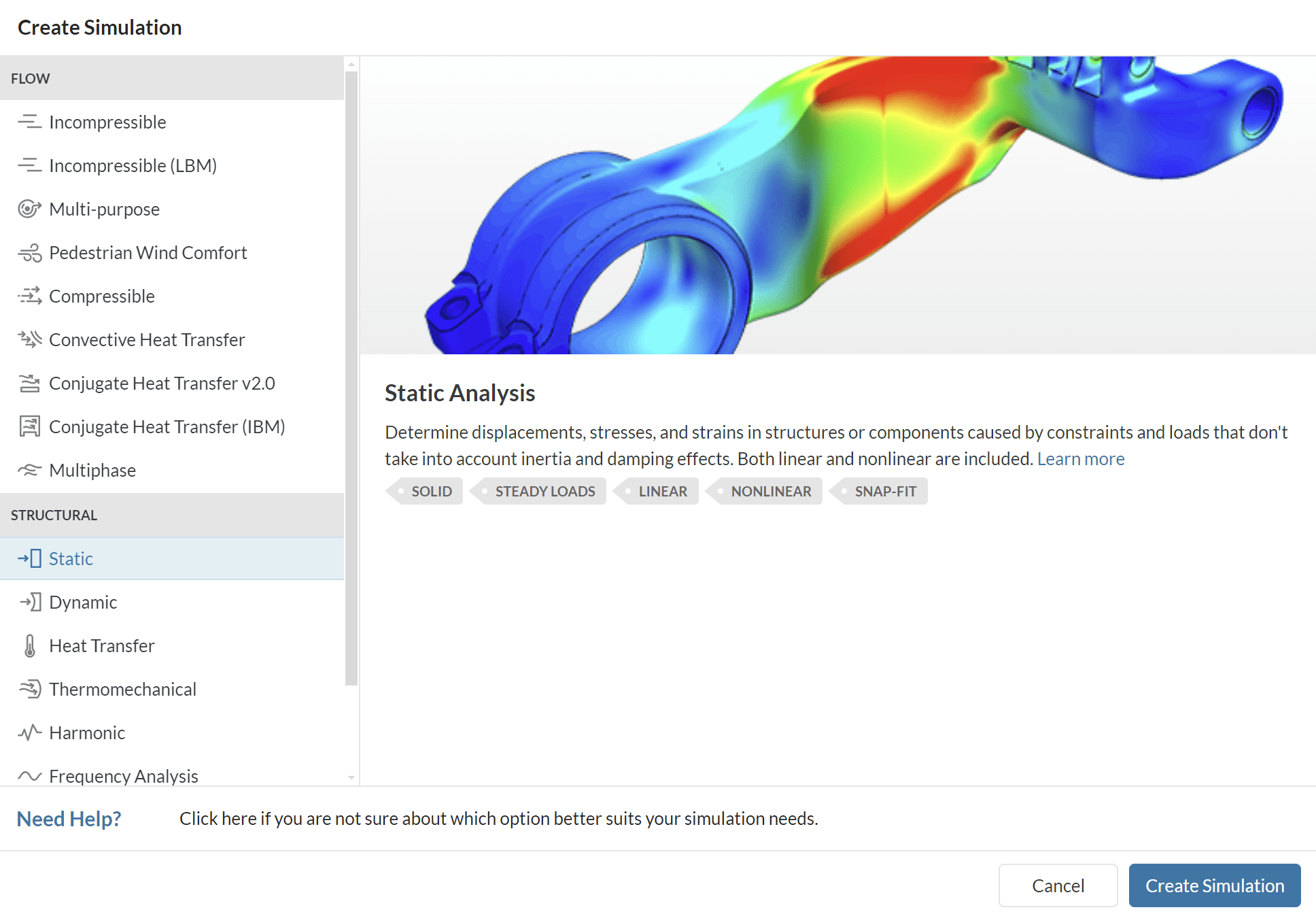 From the list of available simulation types, select ‘Static’, then click ‘Create Simulation’ at the bottom of the window.