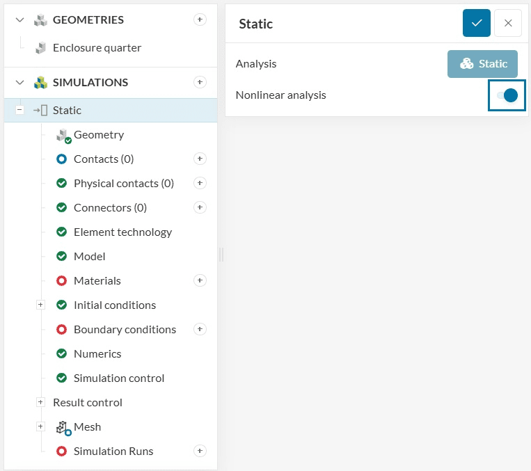 As the ‘Static’ simulation tree item is selected, the general settings panel is shown. The first action we will take is in this panel, by toggling on the ‘Nonlinear analysis’. This will enable the simulation to handle the large displacement of the lid, as well as the physical contacts on the tabs. Before you set the toggle, your simulation tree will look a little bit differently than the one shown in the picture above.