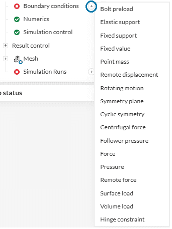To create a boundary condition, simply click the ‘+’ icon next to Boundary conditions, then select from the list the type of boundary condition that you will apply, as shown below: