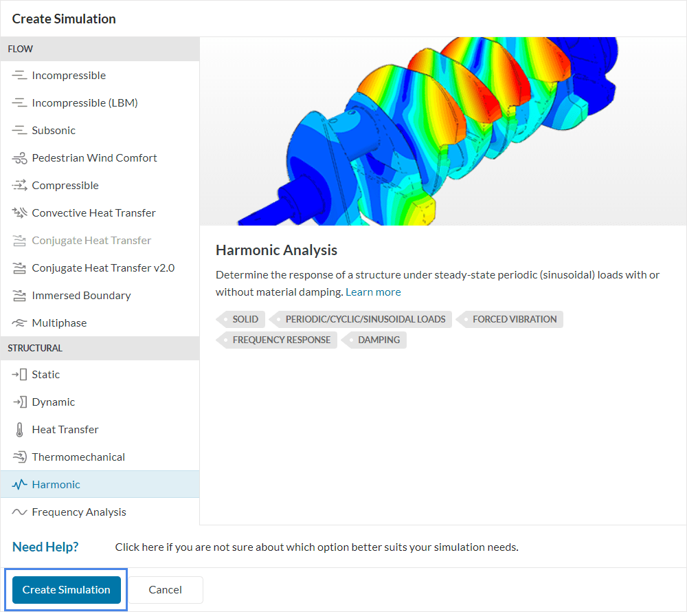 Choose ‘Harmonic‘ as the analysis type and ‘Create the Simulation‘.