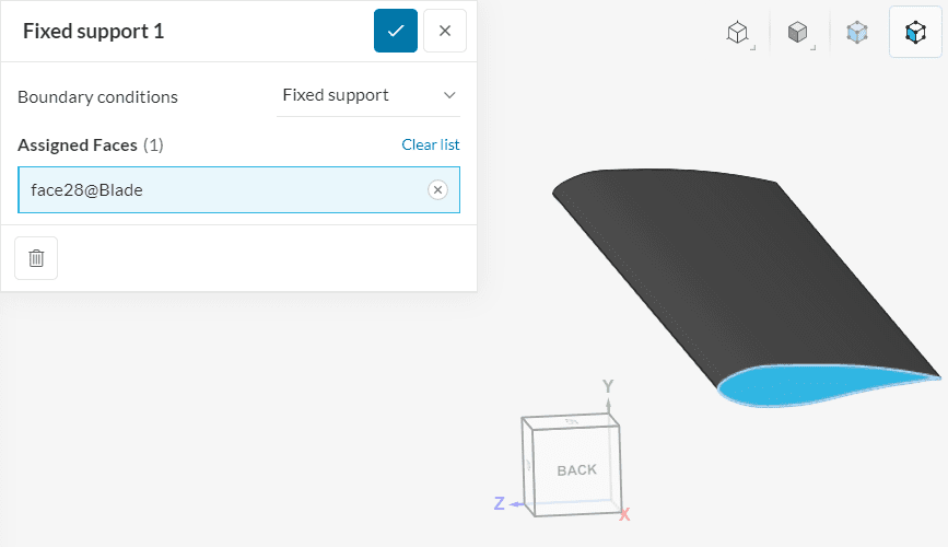 After hitting the ‘+ button’ next to boundary conditions, a drop-down menu opens. From it, one can choose between different boundary conditions. After choosing ‘Fixed support‘, assign it to one of the airfoil’s tips: