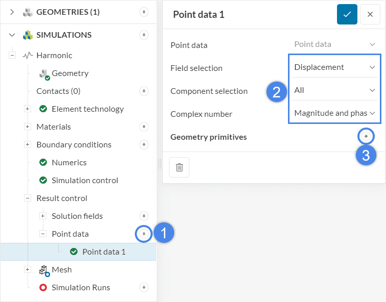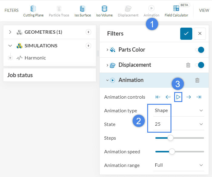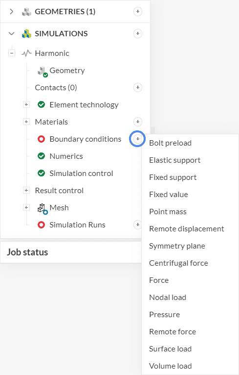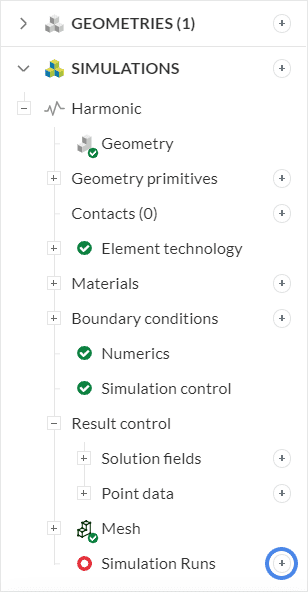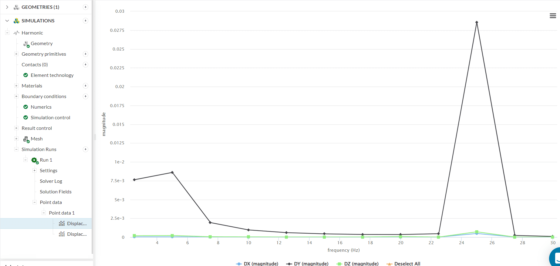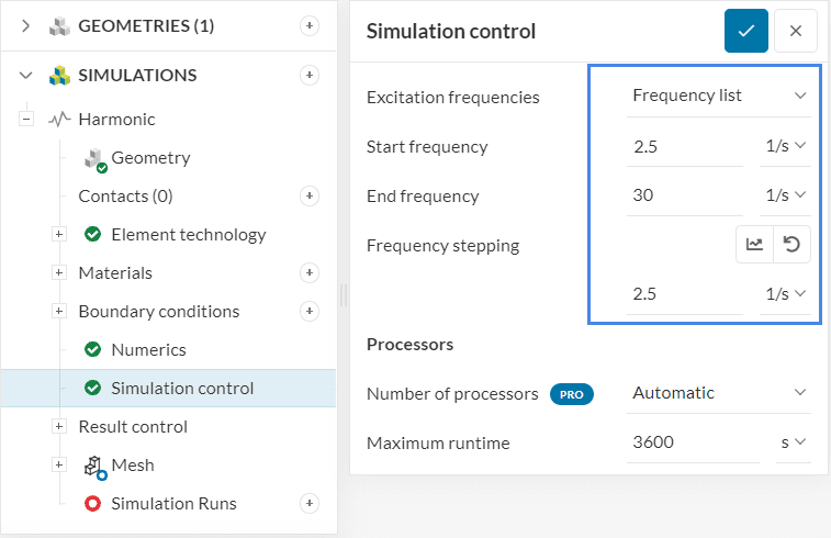 Under Simulation control, you can specify a list of Excitation frequencies, at which the loads will be excited. To specify meaningful excitations for the harmonic analysis, it is important to perform a frequency analysis on the geometry, to gain more insight into the natural frequencies.