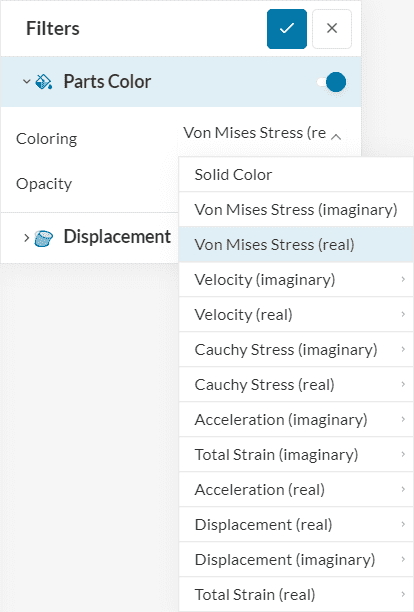 Make sure that ‘Von Mises Stress (real)’ is displayed on the part, under the Coloring section. To improve the quality of your visualization, and make the color transition between blocks smoother, right-click on the legend bar at the bottom of the page, and select the ‘Use continuous scale’ option: