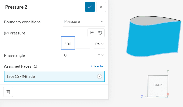 Still based on figure 4, create a second boundary condition and choose ‘Pressure‘. This will be used for the harmonic excitation. Let’s apply a pressure of ‘500‘ \(Pa\) on the bottom face of the airfoil. Phase angle should be kept at 0 degrees in case of a single force.