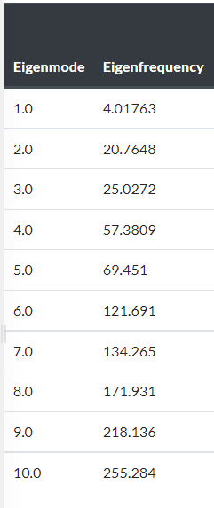 Therefore, the results from the frequency analysis tutorial are important in this step. These are the first 10 modes for the airfoil geometry and their respective natural frequencies. You can find the following figure in the results of the frequency analysis tutorial here: