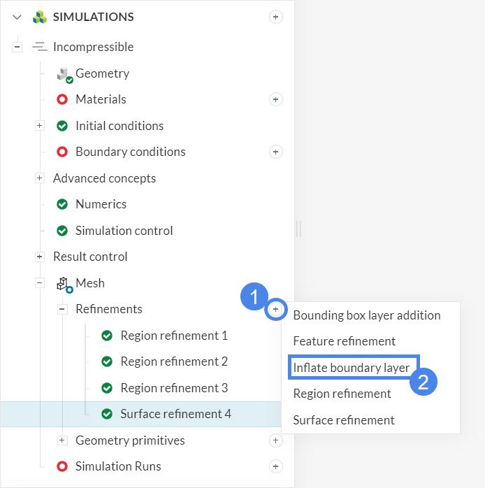 The layer refinement adds a volume mesh with cells aligned to the surface. Add an Inflate boundary layer by clicking on the ‘+’ icon next to the Refinements, and then choosing the ‘Inflate boundary layer’ option.