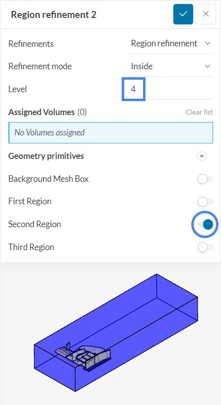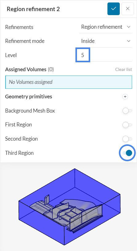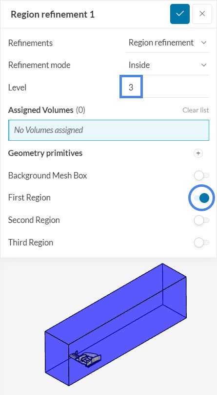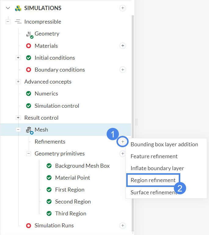 The region refinement is used to refine the volume mesh for one or more user-specified volume regions under Geometry primitives. Add a Region Refinement by clicking on the ‘+’ icon next to the Refinements, and then choosing the ‘Region Refinement’ option.