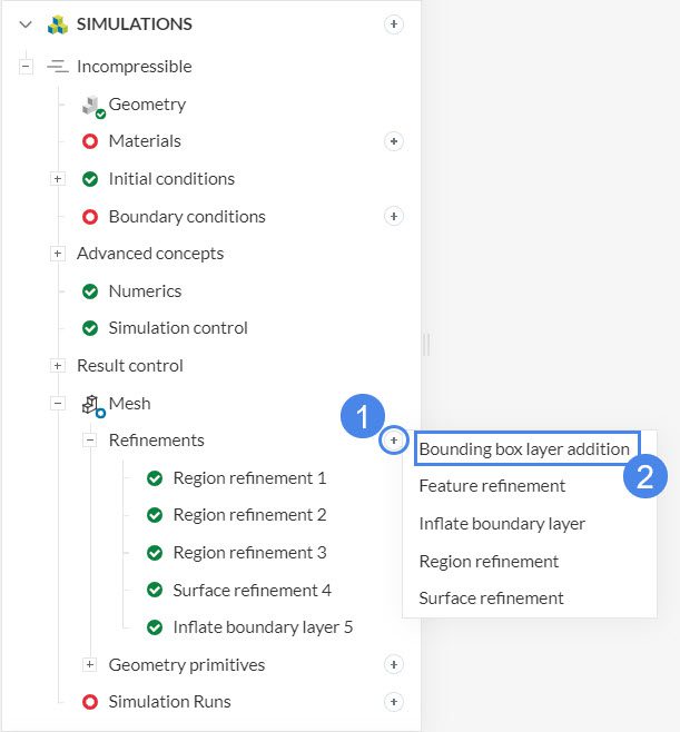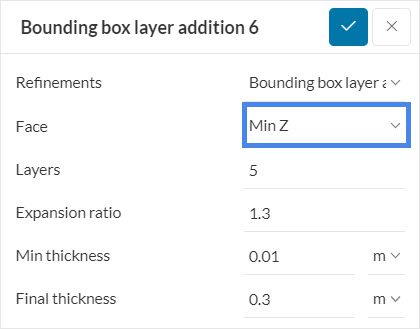 The Bounding box layer addition refinement is similar to the Layer refinement but only applicable to the bounding box. This is mainly useful for external flow analysis where the box surface acts as a wall for the flow domain and must be refined with a layer mesh for accuracy. Add this by clicking on the ‘+’ icon next to the Refinements, and then choosing the ‘Bounding box layer addition’ option.
