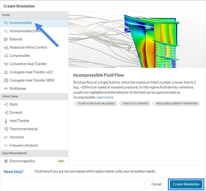 Choose ‘Incompressible fluid flow’ as the analysis type.