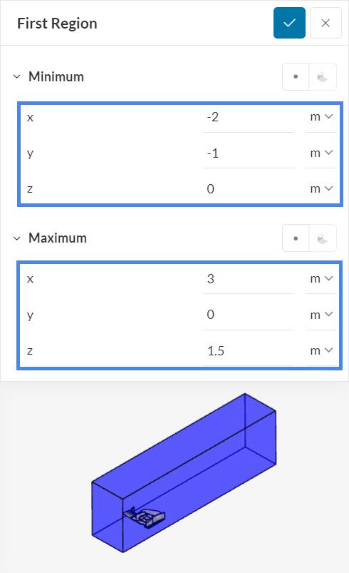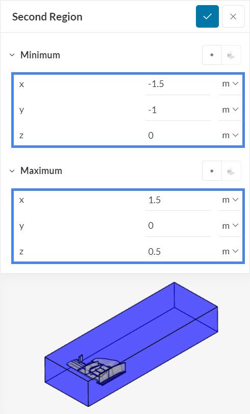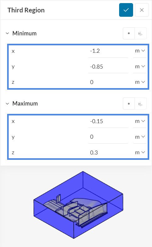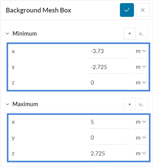 The first cartesian box is the biggest of the three and has the following dimensions, which are set in the same way as the background mesh box, which is by having a maximum and minimum value for each direction: