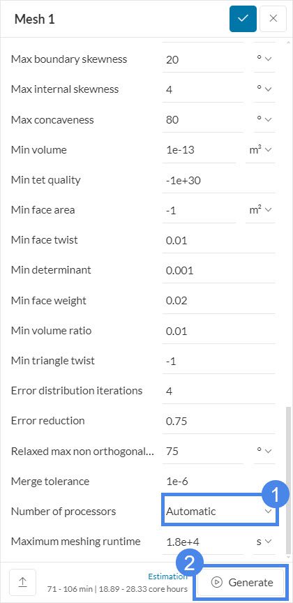Go back to the Mesh panel, change the Numbers of the processors to ‘Automatic’, for optimal usage of computational power, and click on the ‘Generate’ button in order to start with the mesh creation.