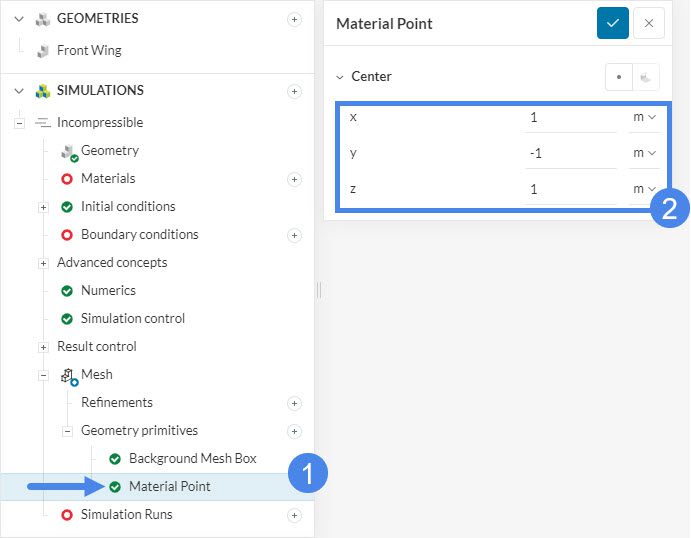 The material point determines whether the resulting mesh is for an External flow simulation or Internal flow simulation. Set its coordinates to ‘(1, -1, 1)’ after clicking on the ‘Material Point’ under the Geometry Primitives item like below: