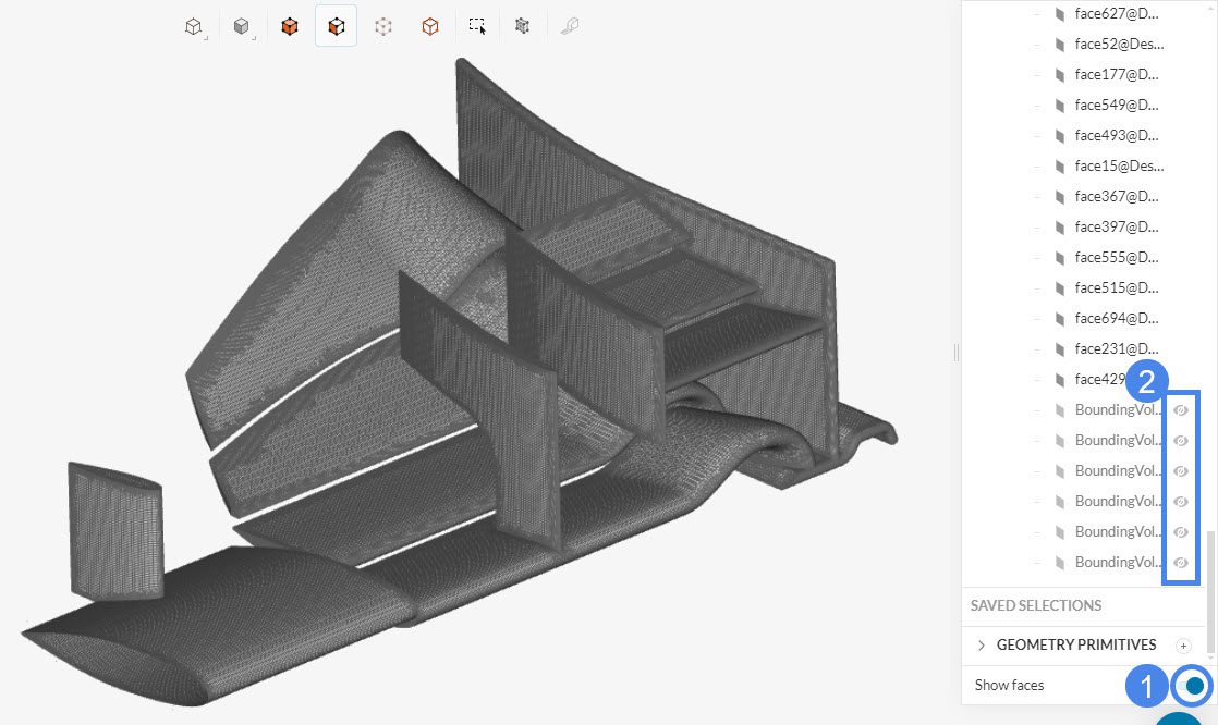 By toggling on the option to Show faces and hiding the faces of the bounding box domain from the tree, you can visualize the final mesh of the front wing: