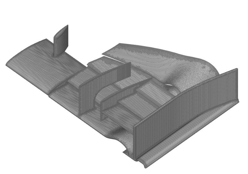 This documentation provides a step-by-step tutorial for a mesh creation of an F1 front wing model, using the “Hex-dominant parametric” approach. The “Hex-dominant parametric” (only for CFD) is the semi-automatic meshing option that uses hexahedral cells and allows full flexibility in meshing parameters with all types of refinement options. The objective is to get a high-quality mesh with sufficient resolution to capture key features in the model.