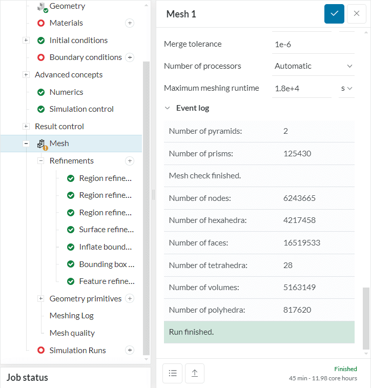 More details about the mesh can be found under Meshing Log. A quick look at the mesh metrics can be accessed under Event log: