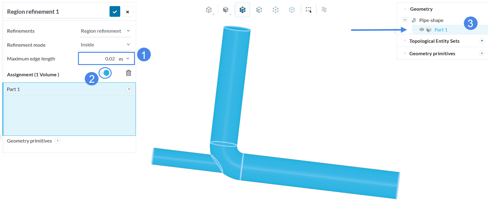 After you pick the ‘Region refinement’, proceed to set the maximum edge length to 0.02 \(m\). Make sure the Assignment is toggled on, and choose the whole part from the geometry tree.