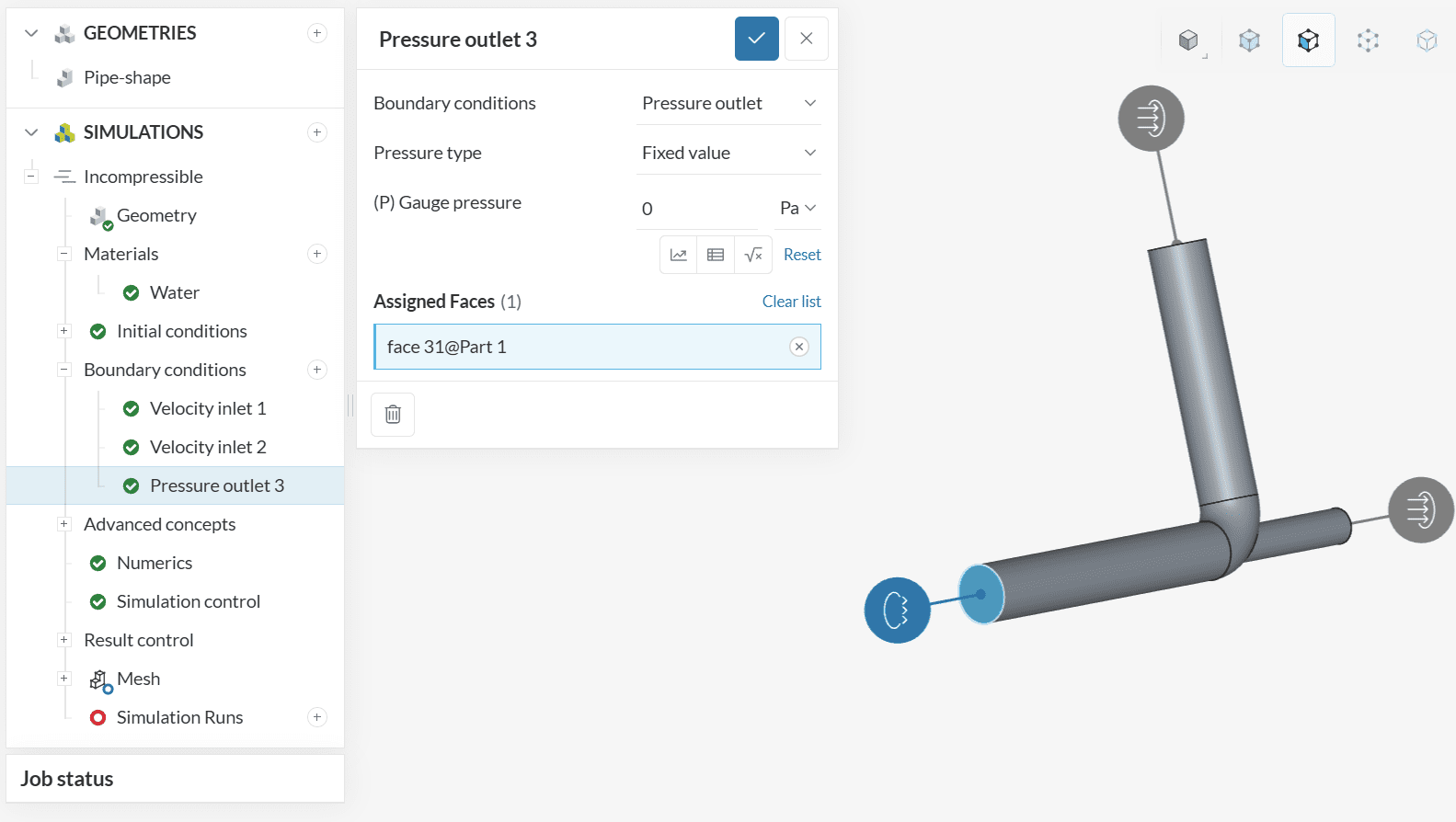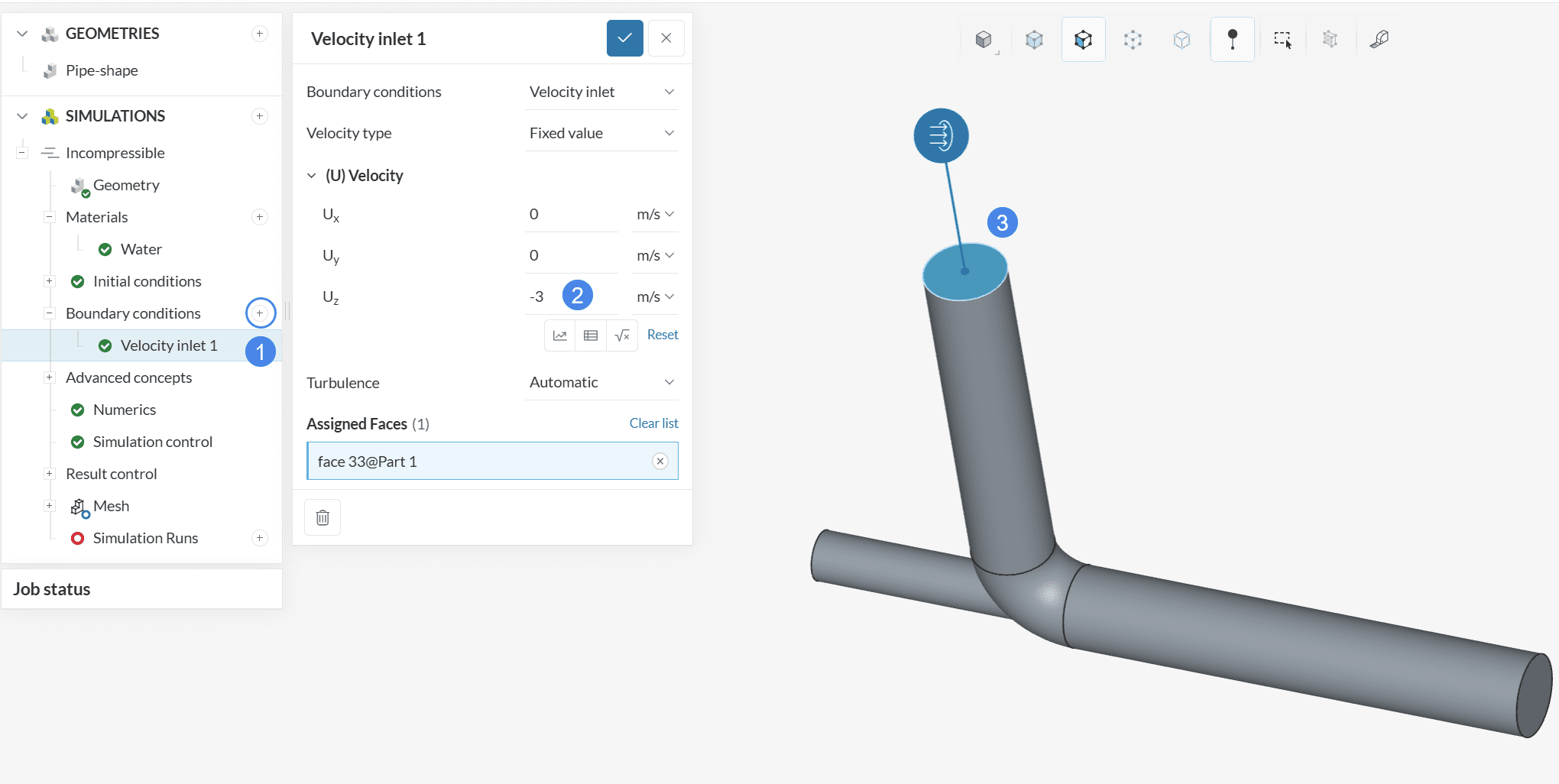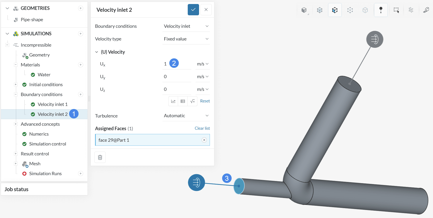 For this simple pipe simulation, we will set up 3 boundary conditions, as seen below: