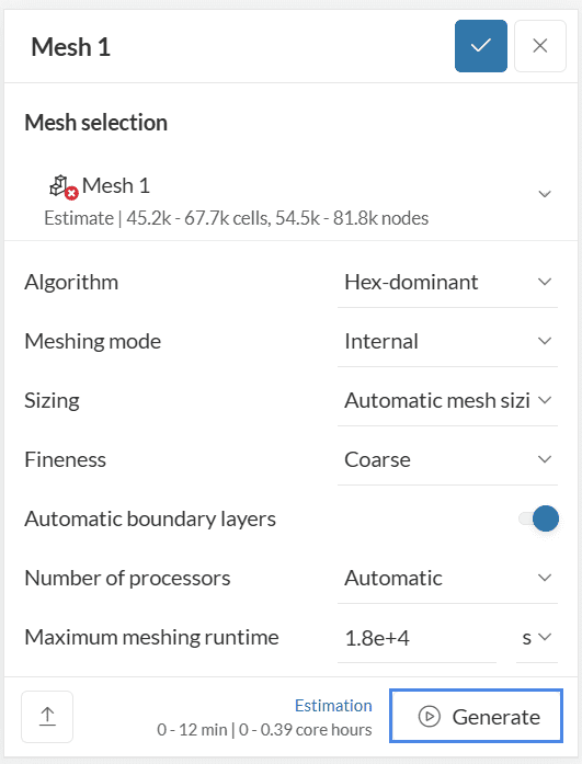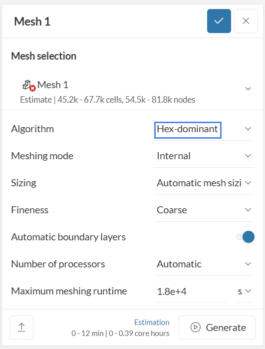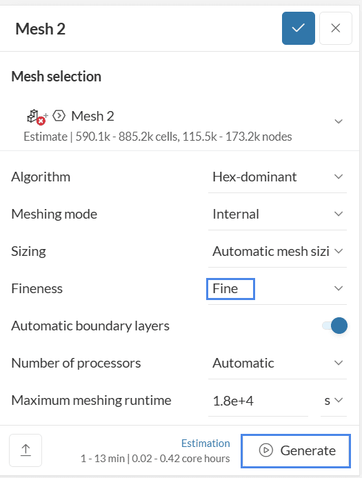 Choose the ‘Hex-dominant‘ algorithm again, then simply change the ‘Fineness‘ level to ‘Fine‘ and ‘Generate‘ the second mesh.