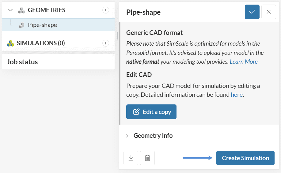 As a first step, we need to create a new simulation. Therefore, left-click on the ‘Pipe-shape’ and then on the ‘Create Simulation’.