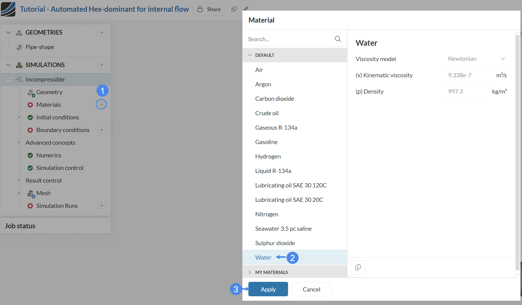 To assign a material to the flow region, click on the ‘+ button’ next to Materials. From the list that appears, choose ‘Water’ and press ‘Apply’ to confirm: