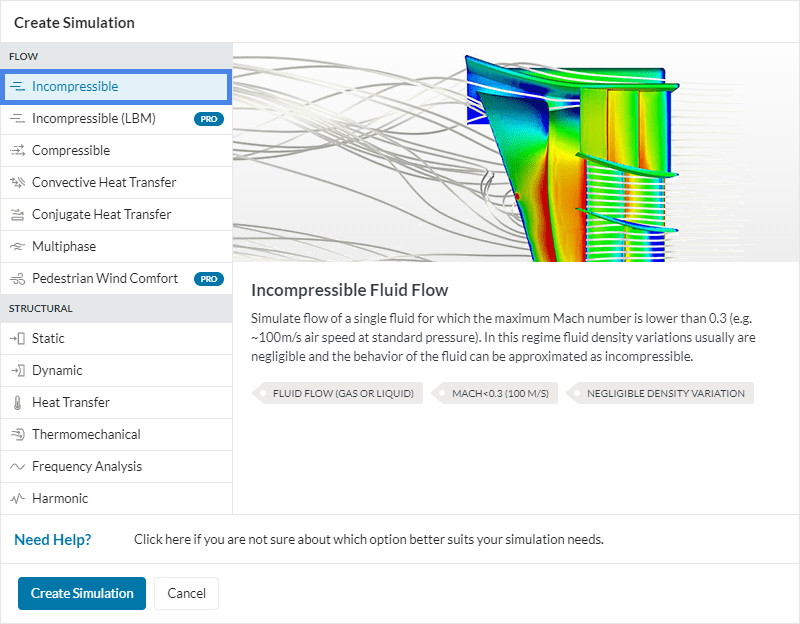 Choose ‘Incompressible’ and click on ‘Create Simulation’.