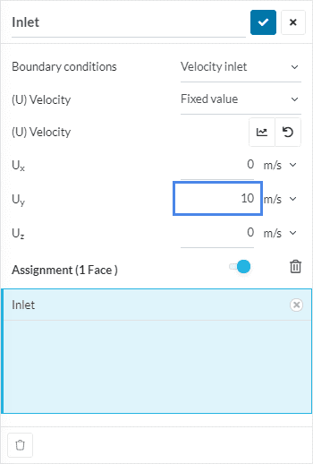 Define a fixed value velocity of ’10 \(m/s\)’ in the y-direction \((U_y)\).