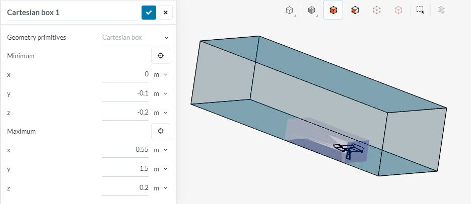 Set the Maximum edge length to ‘0.01 \(m\)’ and click on ‘+’ button to create a ‘Cartesian box’ geometry primitive for the volume assignment:
