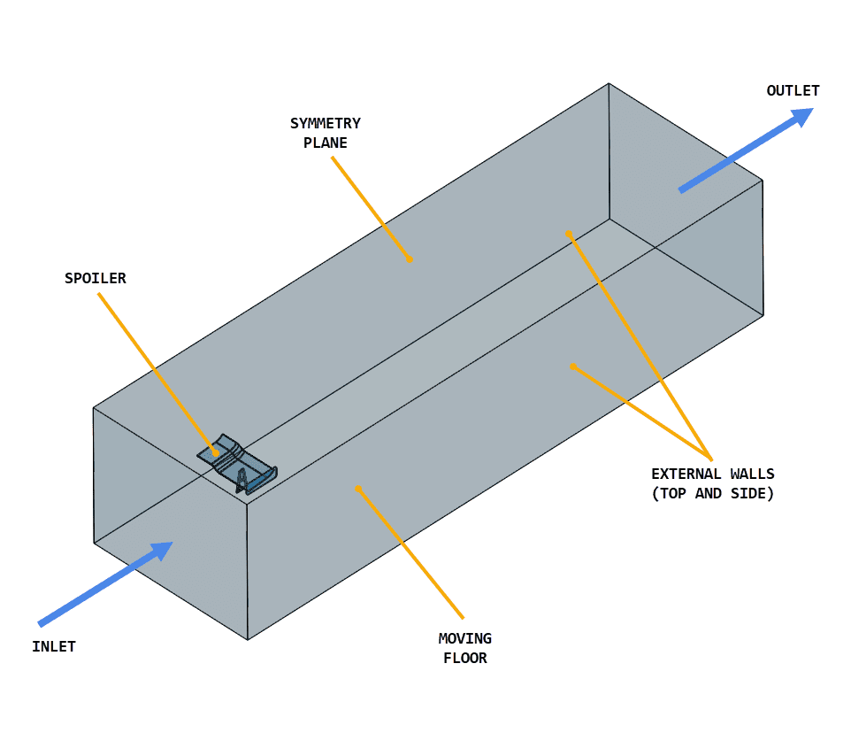 The Spoiler – Flow Region part contains the virtual wind tunnel representing the volume of air around the spoiler. Notice that, as the spoiler is symmetric, we simulate only one-half of the geometry to optimize simulation resources.