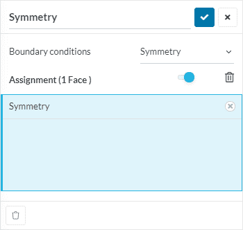 Finally, for the symmetry plane, create a ‘Symmetry’ boundary condition, assigning the ‘Symmetry’ saved selections.