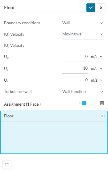Select ‘Moving wall’ for (U) Velocity and assign ’10 \(m/s\)’ to the y-direction.
