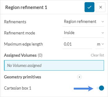 After saving the cartesian box settings, you are redirected to the region refinement settings. Assign the cartesian box that you just created. This ensures that all the cells within this box will have a maximum edge length of 0.01 \(m\).