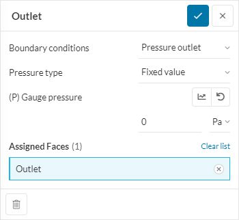For the flow outlet face, a pressure outlet boundary condition will be used. Follow the same procedure as before to create a ‘Pressure outlet’ boundary condition and assign the ‘Outlet’ entity set.