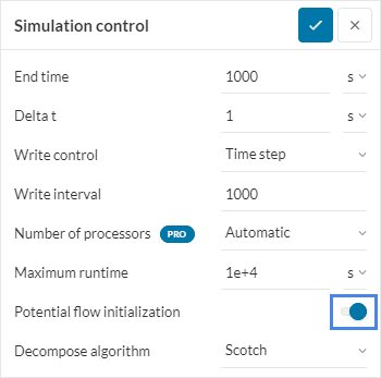 One important setup in order to help the simulation achieve good results and converge faster is the Potential flow initialization. Toggle it on inside the Simulation Control tab, as shown in the figure: