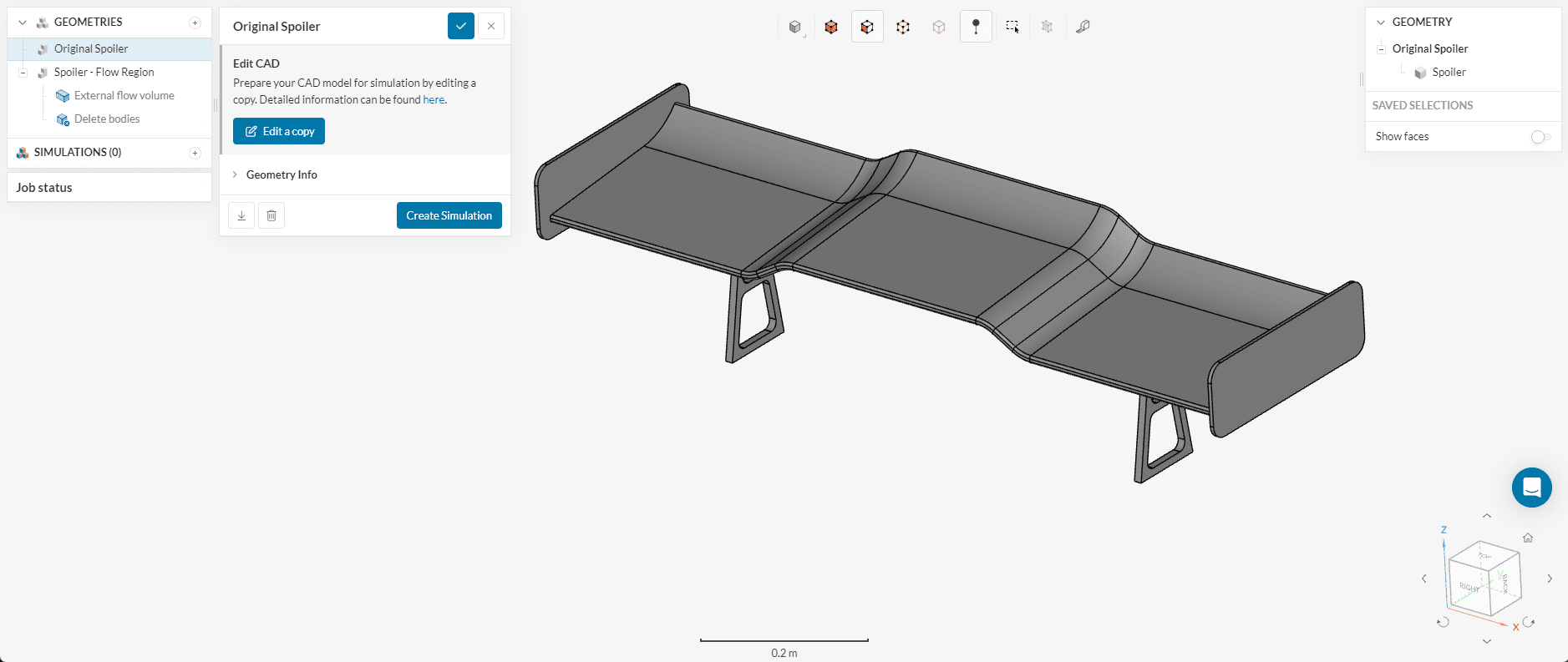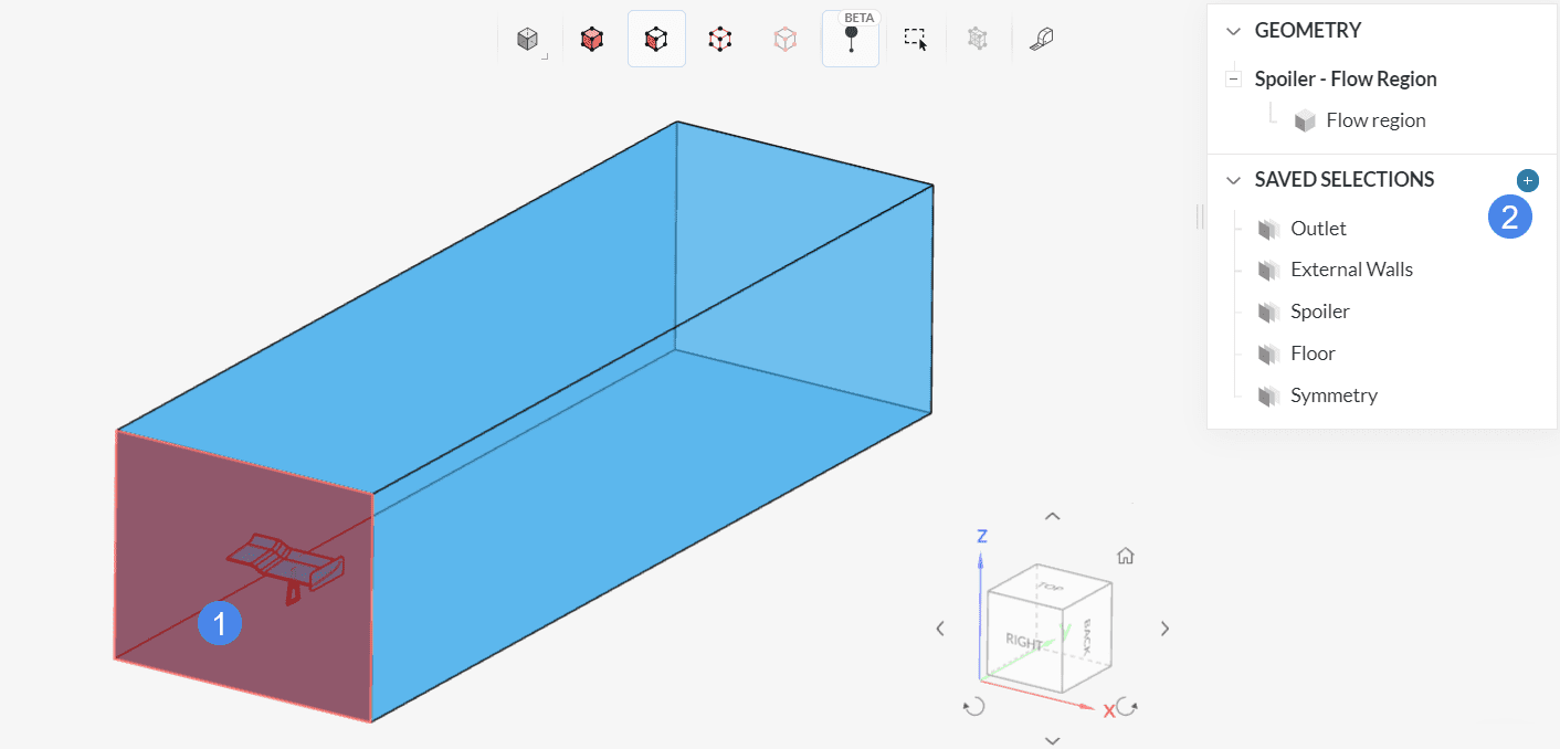 For the simulation setup, we will use the Spoiler – Flow Region geometry. After selecting the geometry, you will find pre-defined saved selections on the right-hand side panel: